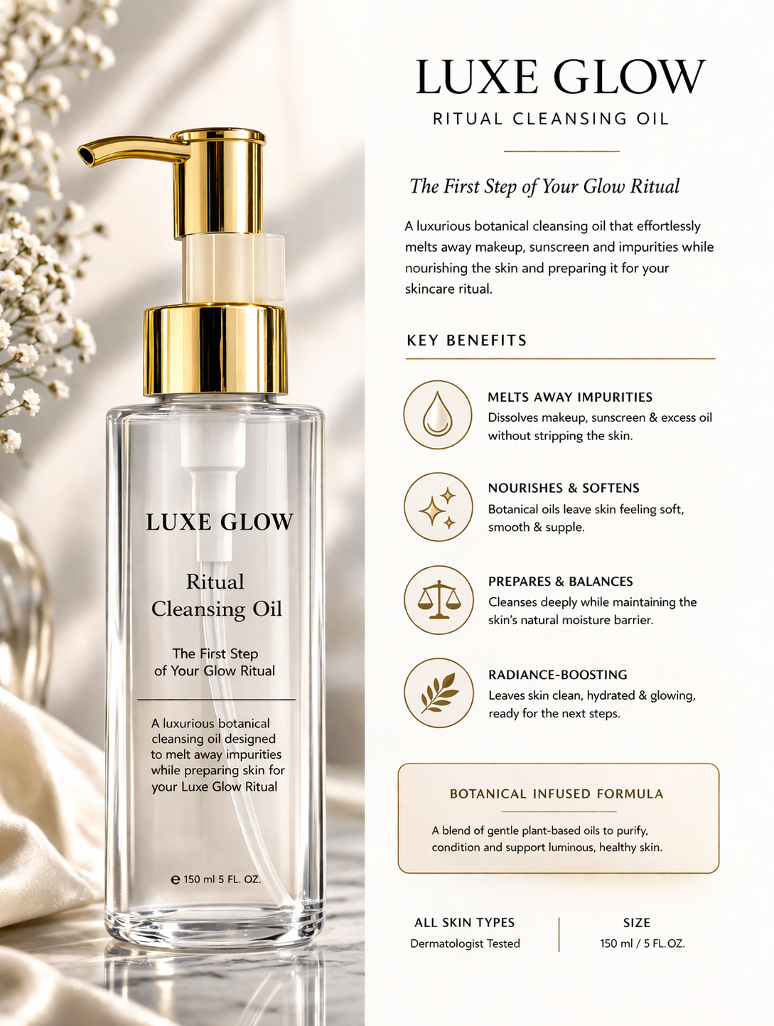 The Luxe Glow Ritual Cleansing Oil is more than a cleanser — it is the first step in your nightly restoration ritual. Designed to gently dissolve makeup, sunscreen, excess oil, and daily impurities, this luxurious oil transforms cleansing into a calming act of self-care.